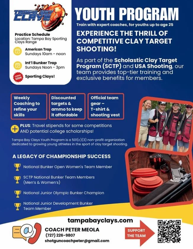Bunker Closed- Youth Team Practice Sunday, February 21, 2027 12:00 PM 1:00 PM 12:00 13:00 Tampa Bay Sporting Clays 10514 Ehren Cutoff Land O Lakes, FL, 34639 United States (map) Google Calendar ICS