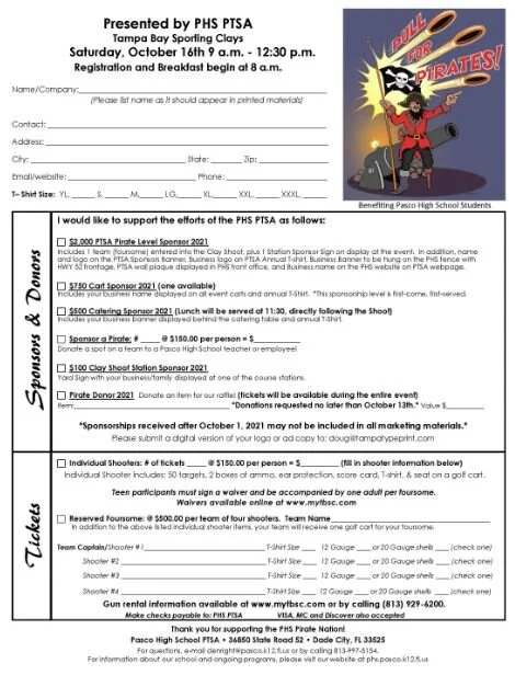 Pasco High PTSA Saturday, October 16, 2021 8:00 AM 1:00 PM 08:00 13:00 Tampa Bay Sporting Clays 10514 Ehren Cutoff Land O Lakes, FL, 34639 United States (map) Google Calendar ICS Info Click Here