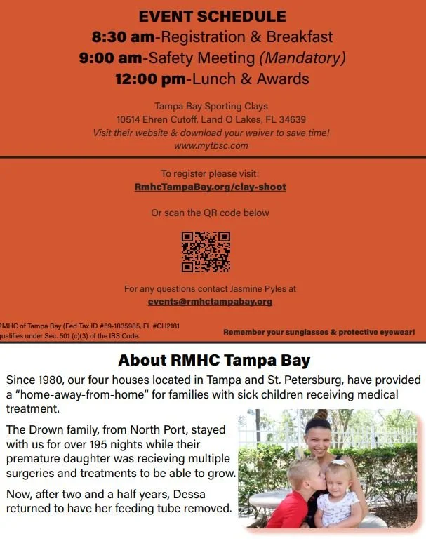 RMHC Friday, March 24, 2023 8:00 AM 1:00 PM 08:00 13:00 Tampa Bay Sporting Clays 10514 Ehren Cutoff Land O Lakes, FL, 34639 United States (map) Google Calendar ICS Click HERE for event registration and additional details.