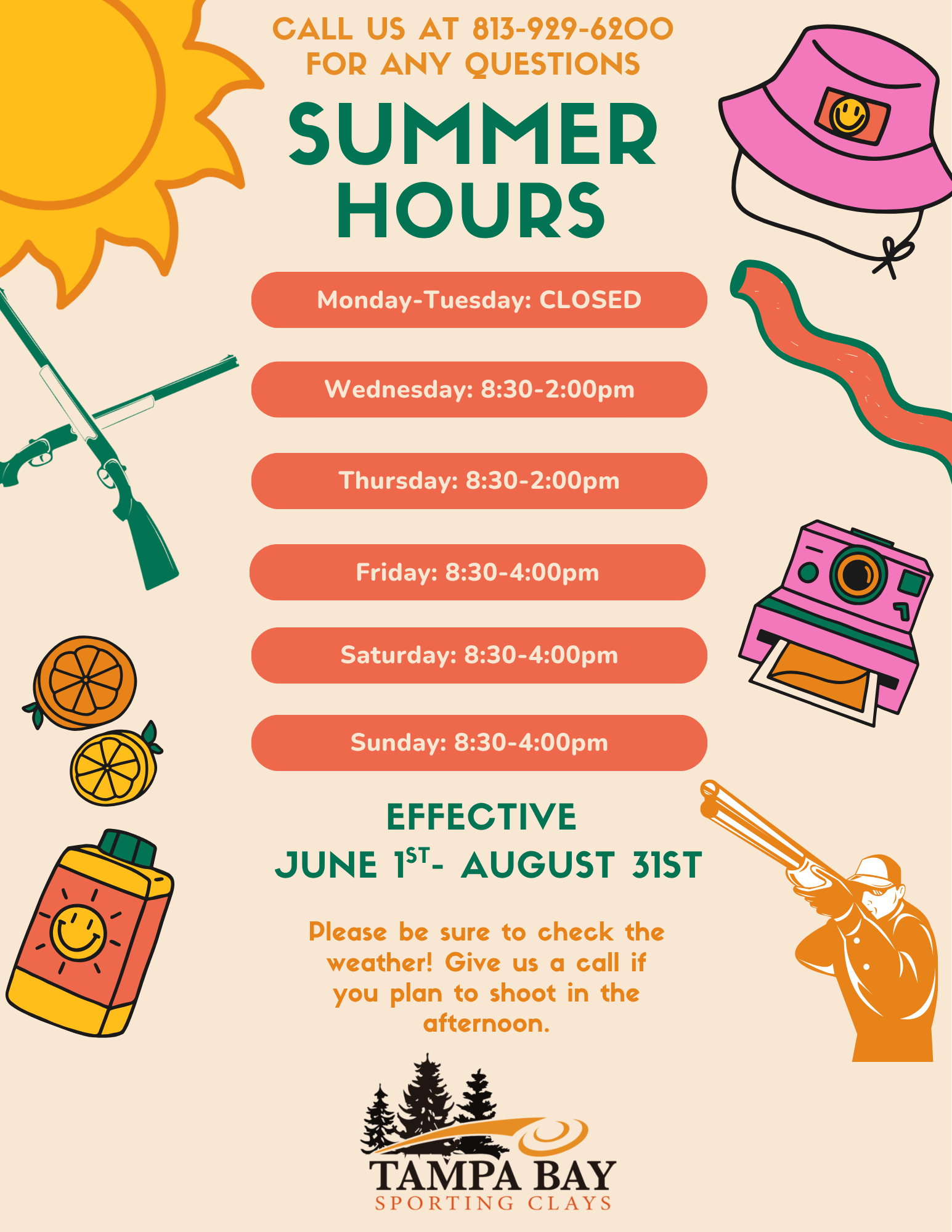 Summer Hours Begin Today! Monday, June 1, 2026 8:00 AM 4:00 PM 08:00 16:00 Tampa Bay Sporting Clays 10514 Ehren Cutoff Land O Lakes, FL, 34639 United States (map) Google Calendar ICS
