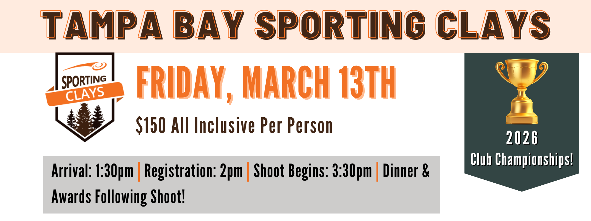 U Club Tampa Friday, March 13, 2026 1:00 PM 5:30 PM 13:00 17:30 Tampa Bay Sporting Clays 10514 Ehren Cutoff Land O Lakes, FL, 34639 United States (map) Google Calendar ICS