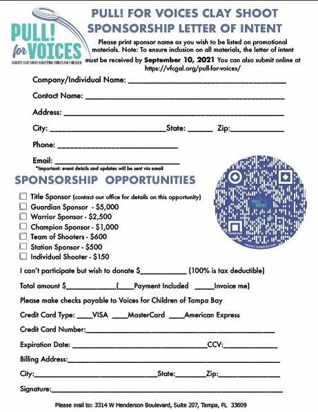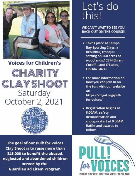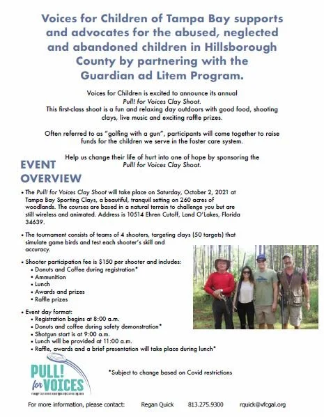 Voices for Children Saturday, October 2, 2021 8:00 AM 1:00 PM 08:00 13:00 Tampa Bay Sporting Clays 10514 Ehren Cutoff Land O Lakes, FL, 34639 United States (map) Google Calendar ICS For registration details, please click HERE.